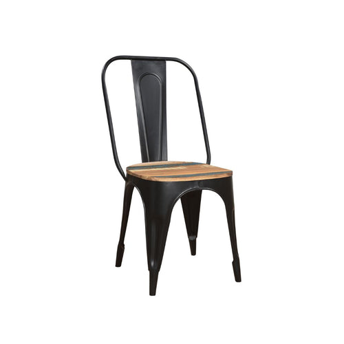 Looking for a chair that has old school charm? This chair is made from a texture-rich, brushed rusted steel frame. The warmth of the brushed steel contrasts with the bolts of colour that are seen in the reclaimed wood seat. These dining table chairs are stackable and combine industrial style with elegant design.