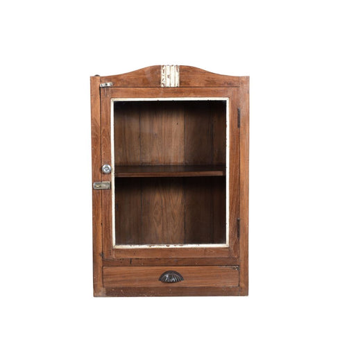 It features a single door with a framed glass pane. The interior compartment features one inner shelf with a letter storage drawer below it. The added details of an ornate seashell cast iron handle and white trim around the glass pane and etched wood at the crown give a nice contrast with the warm colour of the teak wood. Its distressed rustic appearance, white paint accent, and curvaceous trim detail at the crown complement it perfectly.