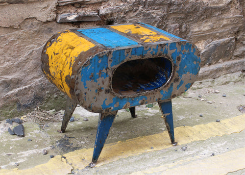 Brilliant art meets practical furniture in this eye-catching Pop Art side table. Brightly painted with excellent style, this small side table is the most unique addition you can add next to a sofa or bed as an accent table. It is sustainable and made from 100% eco-friendly materials. This outdoor side table is handmade from recycled oil barrels, handcrafted in the Tribal communities of Burkina Faso. In addition, there are authentic branding marks and holes from where it was attached to a bike for fuel.