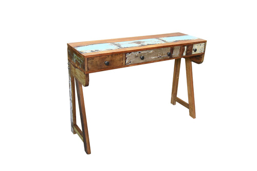 With a bolt of bright colour, this table is a multi-functional wonder. Handcrafted from reclaimed wood, this table has retained its original patina. The patina gives a textured finished to the paintwork while a bold stripe of colour that brightens up the tabletop. Along with its unusual style and simple design, this writing desk can be used as an office desk or a console table, this table is a great addition to any room.
