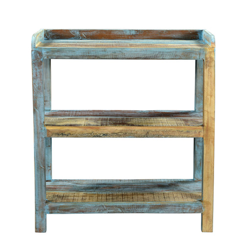 Hand-made from solid hardwood with three shelves for storing different size ornaments. This distressed shelving unit comes in two different colours, one of which is blue with yellow patina shining through. The other is an antique distressed white, which would match any interior space. This would be great in the kitchen as extra storage or beside a kitchen island for tin, jars and pans. Would also be great in a hobby or crafts room for storage and easy access to paint brushes. Could be used as a mini library bookcase as well.