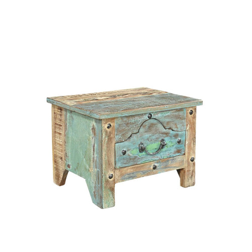 This stunning furniture piece can serve as a side table next to a chair or sofa, a bedside cabinet, or a toy chest for kids. Made from reclaimed wood, the intricately-designed drawer is adorned with trivets. The weathered blue finish adds to the irresistible appeal of this enchanting piece.
