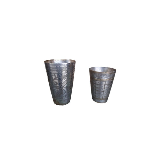 Add a touch of vintage charm to your home with these hand carved metal tumblers. Each piece is one-of-a-kind, making them ideal for creating a unique, eclectic atmosphere. Originally used for Lassi, a traditional beverage from North India, these tumblers now serve as versatile home decor pieces. Their sturdy, heavy construction and stunning nickel finish make them perfect for storing paint brushes or kitchen utensils. Plus, they make for thoughtful and unique gifts for your loved ones. With their lovely swirl pattern and antique feel, these tumblers are sure to add character and style to any space.