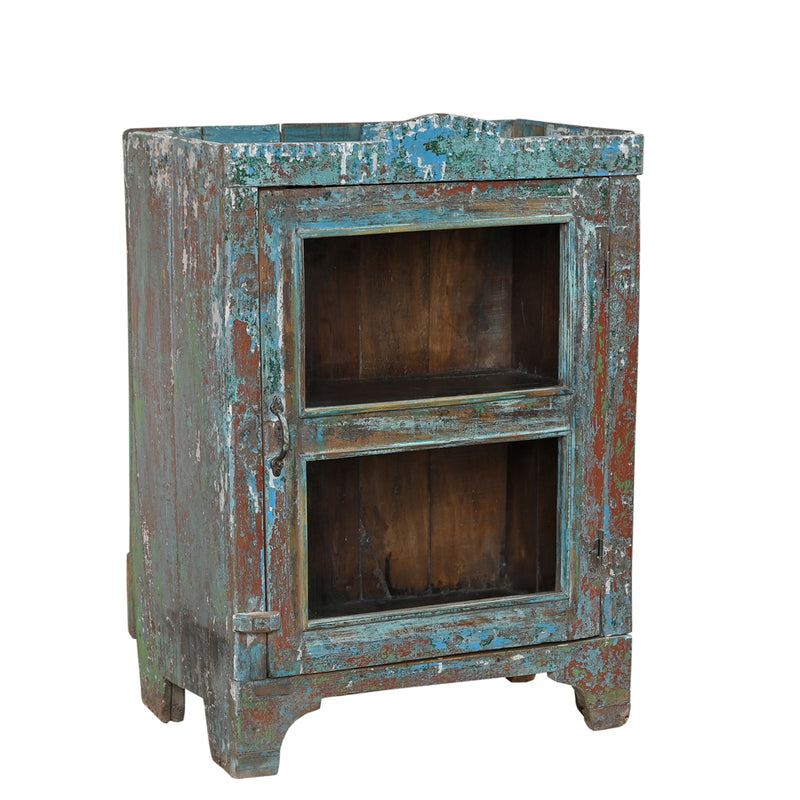 This original vintage cabinet has an unusual design with its full-length glass doors. Inside there are 2 generous shelves to accommodate plenty of storage. The patina is very subtle and will suit any style of interior from country style to retro mid-century. We could see this piece in a kitchen, study or living room.