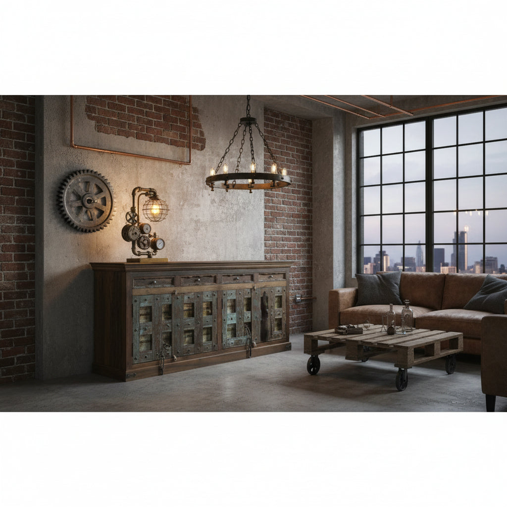 The Gujarat hand-carved console sits directly on the floor and features four doors and convenient interior shelving. At a width span of 236cm, it makes a stunning focal point in any room. The doors and drawer fronts have an elaborately hand-carved grid design for an abstract, antique-inspired look. The original layers of paint on the Shekhawati Doors are preserved to reveal a stunning aqua, teal, and yellow coloured patina finish. Dark metal hardware embellishes the trim around the wood panels of the upcycled doors. With its incredible visual appeal and functionality, this heirloom-quality dresser is sure to become a standout piece of furniture in your home.