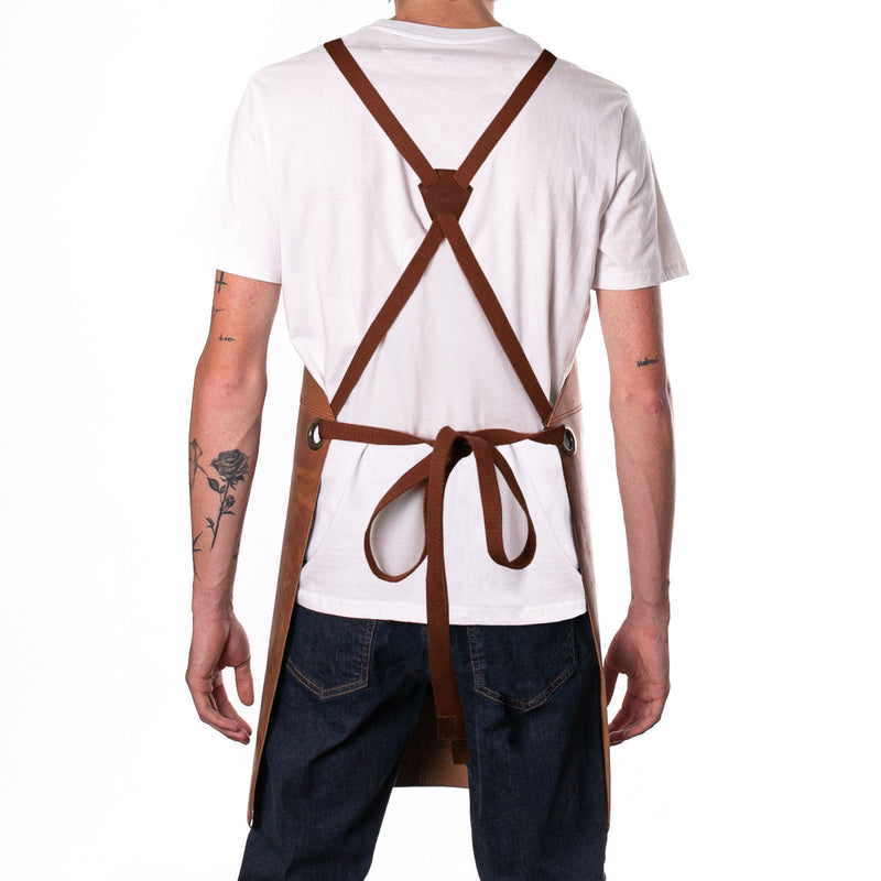 This unisex apron will protect you from dust, grease, water & sparks. The cross-back straps are comfortable in vegetable-tanned leather and will adjust to your body.