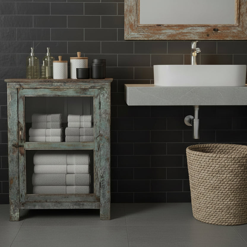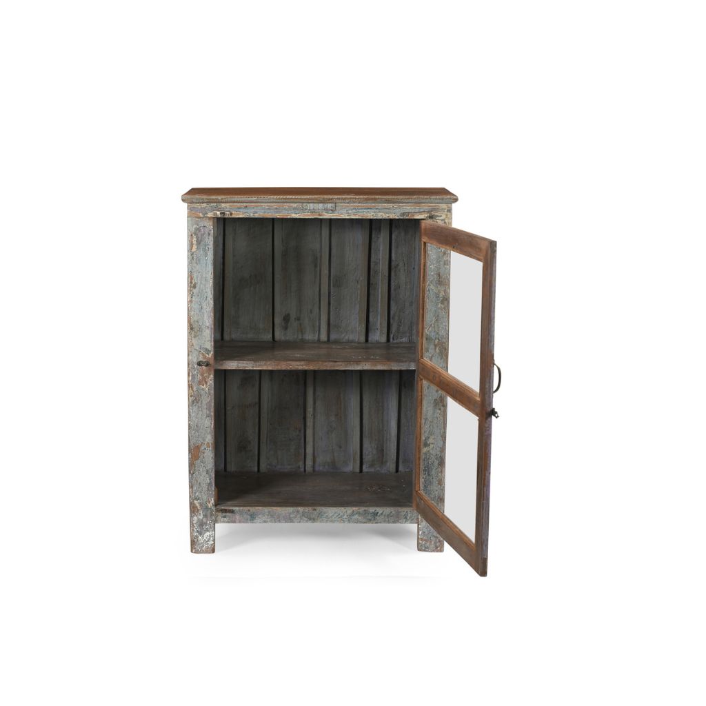 This vintage glass cabinet offers standout character and practical design suited to any home décor. Its solid wood frame features a sleek, minimalist style enhanced by a vibrant multi-colour patina finish. Inside, a spacious shelf provides an ideal spot to showcase or organize your items. With a single glass door and generous height and depth, this cabinet is a rare and valuable addition. A distinctive, versatile piece that brings unique charm to any room.