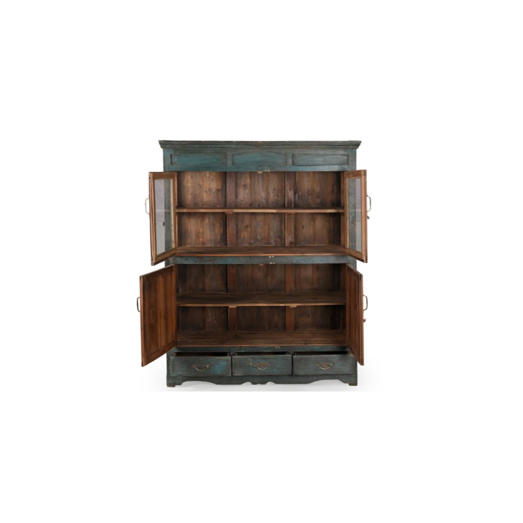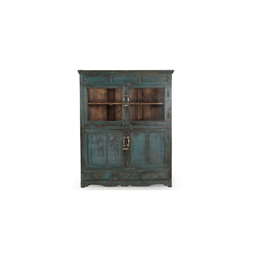 This large glass cabinet features 2 glass doors, 2 plain doors and 2 drawers providing plenty of storage and display space. A unique vintage piece crafted from solid teak and painted in a rich dark blue, this statement furniture brings timeless elegance to any room. Perfect for living rooms, dining rooms, or kitchens, it combines practical storage with sophisticated style. The glass doors showcase your finest pieces while the solid doors and drawers keep everyday items neatly concealed. An authentic vintage find that adds character and functionality to your home.