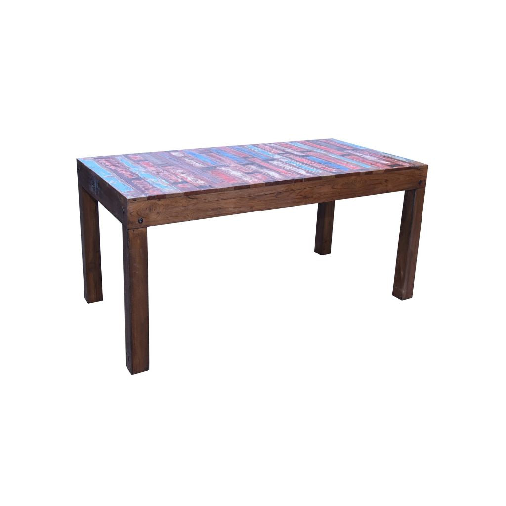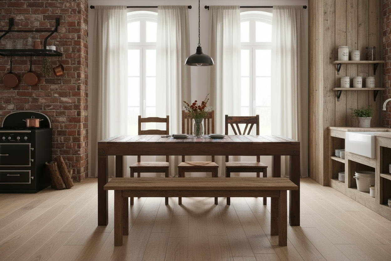 A Rustic style Solid Reclaimed Wood Kitchen or Dining Room Table. Mixed Colour Woods with Solid Chunky Legs. A country farmhouse feels - simple, but with warmth and character.