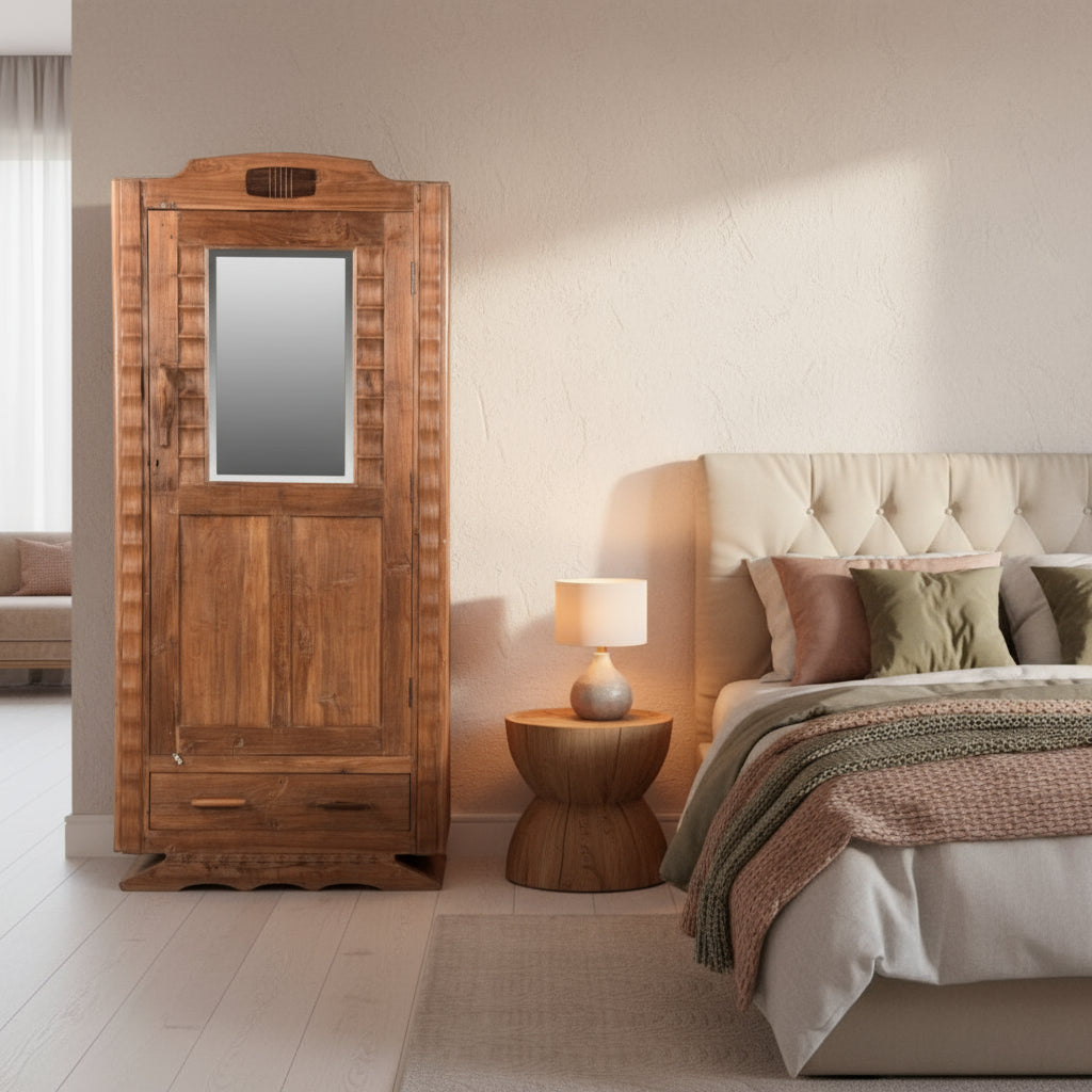 The Fluted Cabinet is an extraordinary design. The size and storage of the tall stand-alone locker cabinet provide great utility while retaining a striking aesthetic with the incredibly hand-carved fluted details. This piece can be used as a bar cabinet or a jewellery vanity cabinet. It is a lovely vintage wood kitchen cabinet that commands attention with an overall height of 190cm.