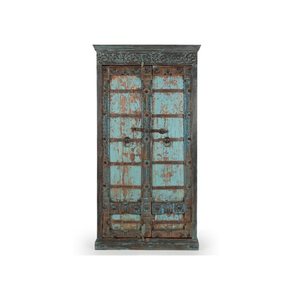A striking freestanding cabinet that marries heritage craftsmanship with contemporary storage solutions. The Vedda Shekawati features an original antique Shekawati door panel as its focal point, showcasing intricate hand-carved detailing in captivating shades of teal, blue, and green. The substantial frame is constructed from reclaimed wood, lending authentic character and sustainability to this statement piece. Thoughtfully designed with four internal shelves positioned at 50cm intervals, this cabinet offers generous storage capacity ideal for displaying collections, storing tableware, or organising everyday essentials. The generous proportions—112cm wide, 50cm deep, and 216cm tall—make it a commanding presence in any room, whether positioned in the kitchen, dining area, or living space. Each cabinet is a unique creation, where the exquisite hand-carved artistry of the antique door panels combines with the warmth of reclaimed wood to create a truly distinctive furniture investment. A sophisticated choice for those seeking both functional storage and an authentic conversation piece.