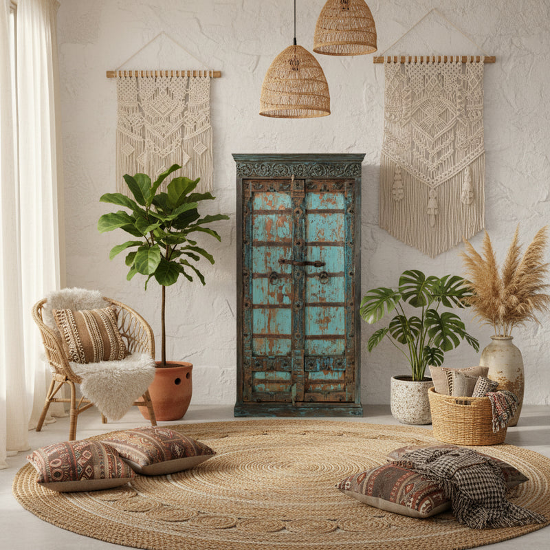 The exquisite two-door cabinet showcases a captivating blue green patina finish and boasts meticulous craftsmanship with ample storage space. Its sturdy doors and well-designed interior make it an ideal choice for showcasing cherished possessions. This Cabinet is versatile and can be used as a luxurious kitchen pantry, a sophisticated living room centerpiece, or a stylish drinks cabinet in the dining room. With a stunning wooden frame and elegant plain doors featuring a lively blue green patina, this rustic cabinet offers ample room for storing baking essentials, cookware, or even your most prized beverages.