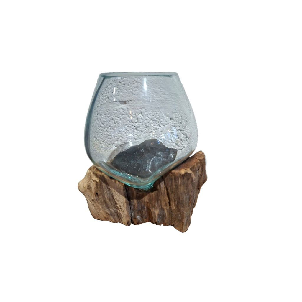 Candle holder or mini vase made of recycled glass melted onto a base of teak root.